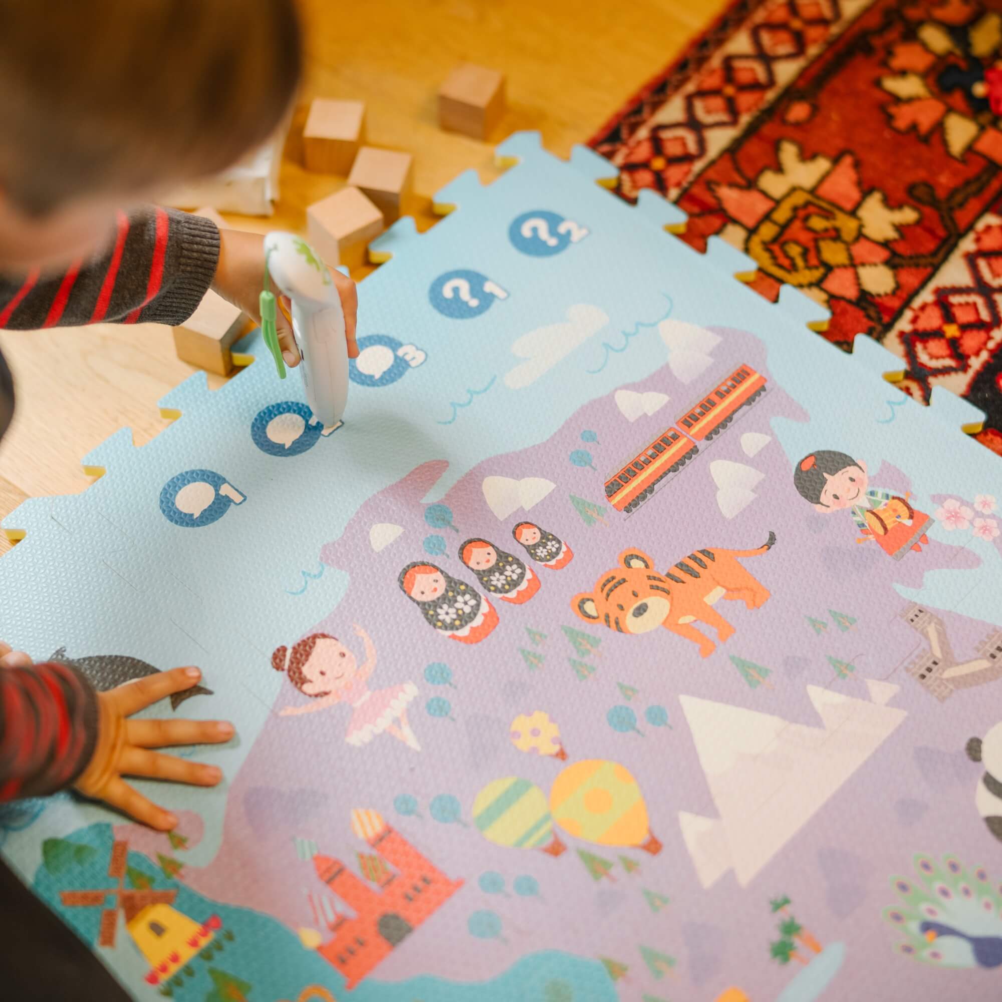 Le tapis d'éveil interactif musical Magic Mat : un jeu éducatif, évolutif et interactif, pensé par la famille Looping. Votre enfant va découvrir les animaux, coutumes, monuments de tous les continents !